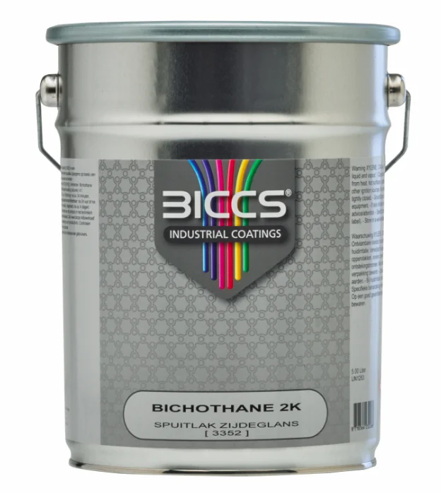 Biccs Bichothane 2K-PU Spuitlak Zijdeglans [3352] is een oplosmiddelhoudende 2 componenten spuitlak zijdelans op basis van polyurethaanhars met een isocyanaat verharder. Het product wordt voornamelijk gebruikt voor uiteenlopende zwaardere industriële toepassingen zoals machines, rollend materieel, staalbouw en overige constructies waaraan hoge eisen worden gesteld.