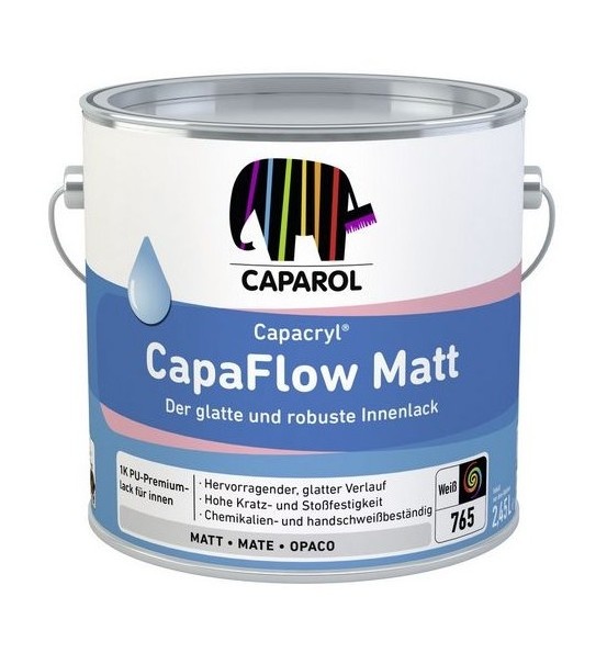 Caparol Capacryl Capaflow Mat is een hoogwaardige, kras- en stootvaste polyurethaan-acrylaatlak (watergedragen) voor schilderwerk binnen en buiten. Dit product is zeer eenvoudig te verwerken en beschikt over hoogwaardige eigenschappen. Met dit product voorzie je oppervlakken van een waterdampdoorlatende, kras- en stootvaste voor- en aflaklaag. Hij is geschikt als afwerking op maatvast houtwerk, PVC en roestwerend behandeld staal. Denk dus aan het voor- en aflakken van kinderspeelgoed, kozijnen, deuren, trappen, meubilair, plinten, etc. Bij donkere, intensieve kleuren kan in sommige gevallen lichte pigmentafgifte ontstaan. Bij toepassing van minder goed dekkende kleuren, zoals rood, oranje en geel, verdient het aanbeveling om een grondlaag aan te brengen in een op de eindkleur afgestemde grondkleur.