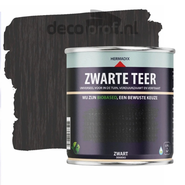 Hermadix Impraline Zwarte Teer is bijzonder fraai om toe te passen op zwarte schuren, schuttingen en houtwerk. Dit product beschermt hout tegen weersinvloeden, en geeft de karakteristieke uitstraling. Hij is uitstekend geschikt op geïmpregneerd- en douglashout, bielzen, en rolborders. Hermadix Impraline Zwarte Teer zal altijd een beetje blijven 'poederen' en afgeven. Het is dus niet geschikt voor banken of tafels. Hiervoor kunt u beter Hermadix tuindecoratie beits nemen, deze is ook in het zwart verkrijgbaar.Bij gebruik op onbehandeld zacht hout het oppervlak eerst voorbehandelen met de Hermadix Impraline Pre-Activ. Je kan dit product verwerken met een kwast of roller bij temperaturen tussen de 10°C en 25°C. Het is van belang dat er wordt aangebracht tijdens drogend weer (geen hoge luchtvochtigheid). De levensduur van goed behandelde oppervlakken is 5-7 jaar, afhankelijk van de omstandigheden en laagdikte. Goed roeren voor gebruik.