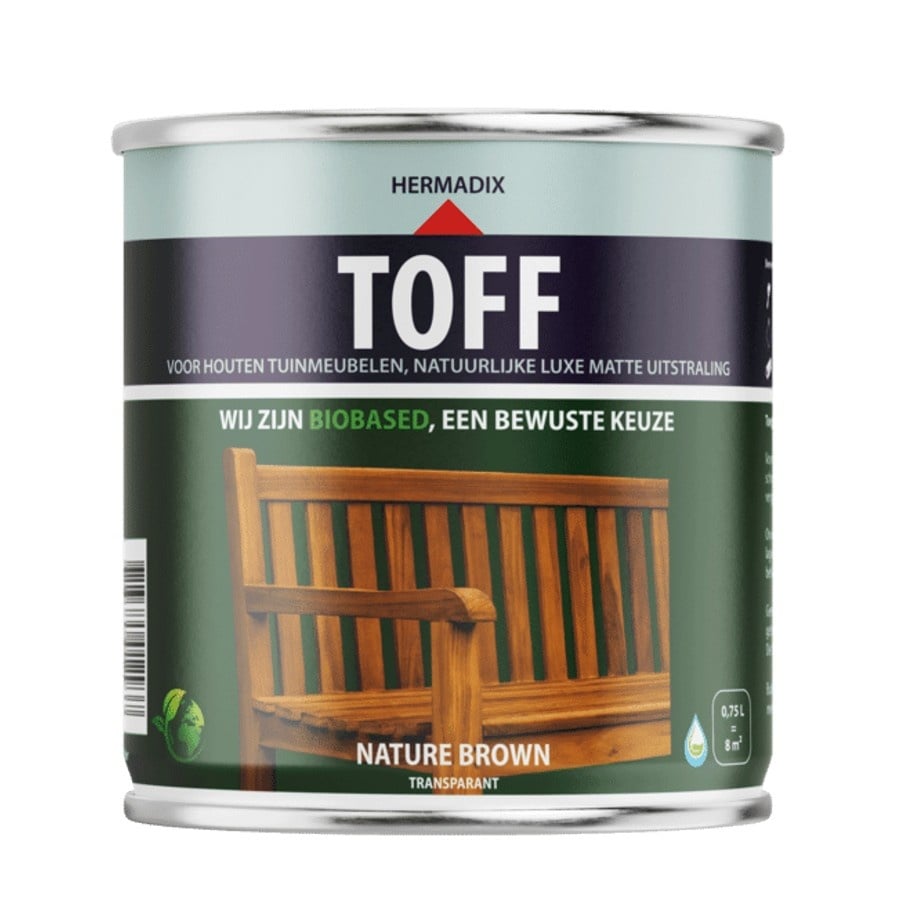 Ben jij op zoek naar matte houtolie voor hardhouten tuinmeubelen op waterbasis? Hermadix Toff Hardhout Olie Nature Brown is een natuurlijke onderhoudsolie speciaal voor het beschermen en kleuren van hardhouten tuinmeubelen. Je kan hem toepassen op zowel nieuwe, als bestaande hardhouten tuinmeubelen. Denk hierbij aan het duurzaam beschermen en kleuren van je tuintafels, banken, stoelen, kastjes en ander buitenmeubilair. Dit product is watergedragen, en daardoor minder belastend voor mens en milieu. Daarnaast zal je geen last ondervingen van een nare verflucht en is schilderwerk snel droog. Dit product wordt veelal gekozen door doe-het-zelvers vanwege zijn gemakkelijke verwerking en duurzame bescherming. Behandelde oppervlakken zullen, afhankelijk van de omstandigheden en aangebrachte laagdikte, circa 3-4 jaar onderhoudsvrij zijn. Ben jij benieuwd of de Hermadix Toff Hardhout Olie Nature Brown de juiste keuze is voor jou?