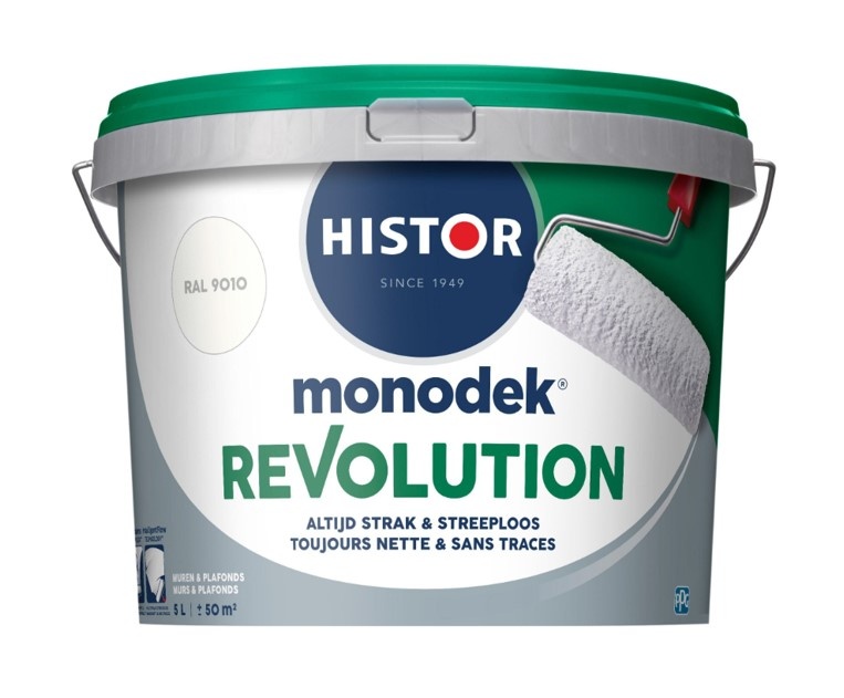 De Histor Monodek Revolution Muurverf is beschikbaar in 100% wit, RAL 9010 en RAL 9016. De verschillende kleuren zijn alleen beschikbaar als matte muurverf in 5L en 10L.