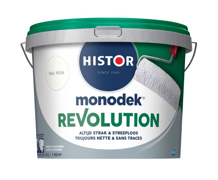 De Histor Monodek Revolution Muurverf is beschikbaar in 100% wit, RAL 9010 en RAL 9016. De verschillende kleuren zijn alleen beschikbaar als matte muurverf in 5L en 10L.