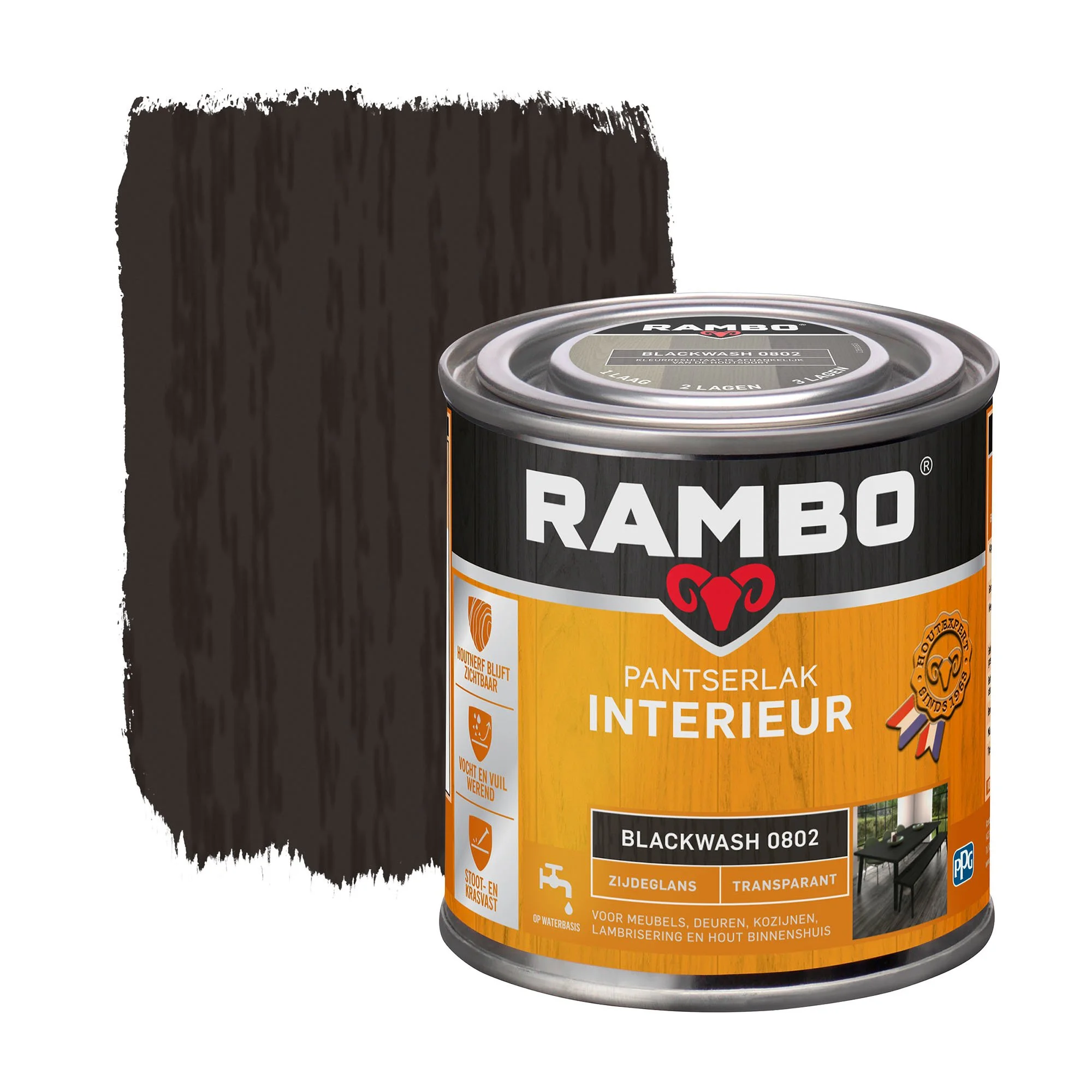 Rambo Pantserlak Interieur Transparant Zijdeglans Blackwash 0802 behoudt extra lang glans, is geurarm én breed toepasbaar. De houtsoort en het aantal aangebrachte lagen beïnvloeden de kleur en glans. Wij adviseren daarom om ter beoordeling van het resultaat een test uit te voeren en een proefvlak op te zetten. Op eikenhout altijd eerst een proefvlak opzetten in verband met de uittreding van inhoudsstoffen.