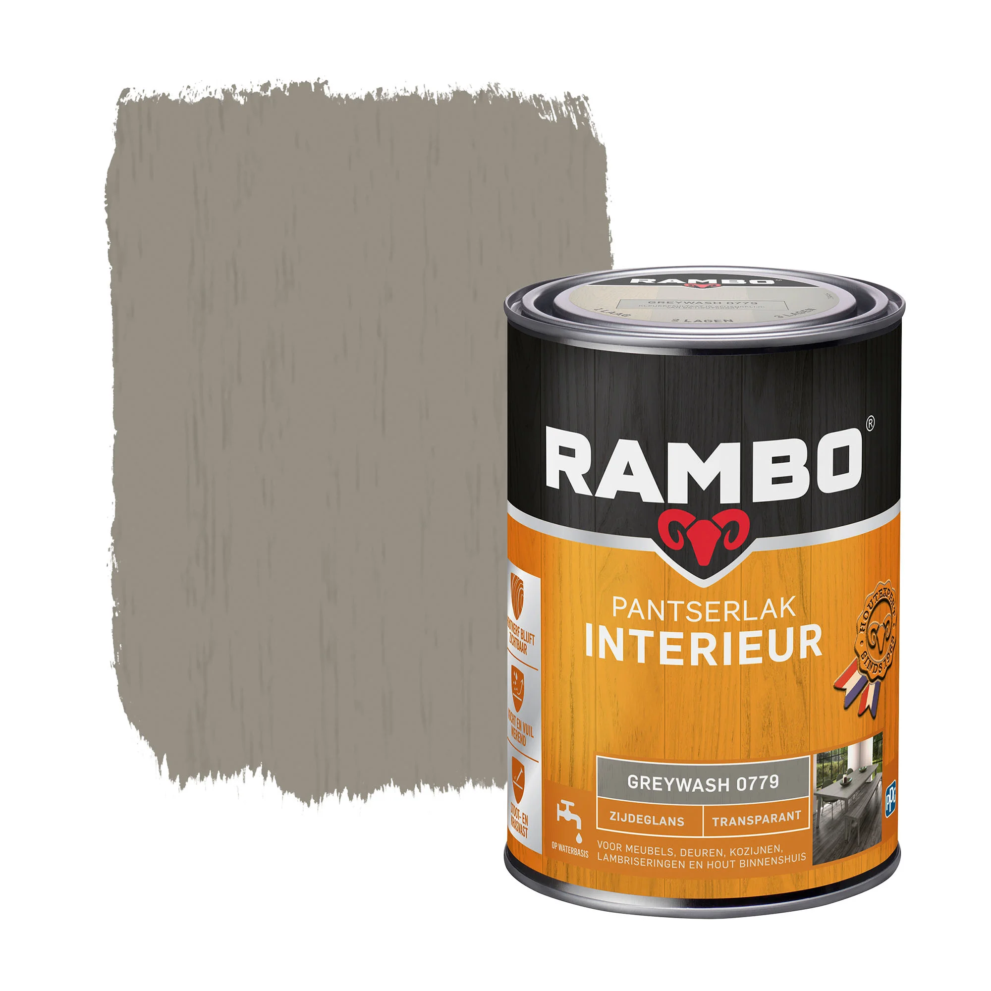 Rambo Pantserlak Interieur Transparant Zijdeglans Greywash 0779 behoudt extra lang glans, is geurarm én breed toepasbaar. De houtsoort en het aantal aangebrachte lagen beïnvloeden de kleur en glans. Wij adviseren daarom om ter beoordeling van het resultaat een test uit te voeren en een proefvlak op te zetten. Op eikenhout altijd eerst een proefvlak opzetten in verband met de uittreding van inhoudsstoffen.