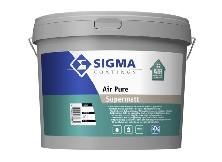 Wil jij een verf die goed is voor mens en natuur? Sigma Air Pure Supermatt is een luchtzuiverende biobased muurverf voor het behandelen van diverse ondergronden binnenshuis. In de lucht om ons heen zitten veel stoffen en gassen die niet goed zijn voor de gezondheid. Op het eerste oog heb je daar niet zoveel last van, totdat het teveel wordt. De Sigma Air Pure Supermatt is een unieke luchtzuiverende muurverf die tot wel 70% van deze slechte stoffen en gassen zuivert uit de lucht. Los hiervan is het een vertrouwde kwaliteitsmuurverf welke je breed kan inzetten op diverse steenachtige ondergronden. Gebruik dit product bijvoorbeeld op beton, stucwerk, schuurwerk, gipsplaten en metselwerk. Aanvullend kan deze verf ook gebruikt worden op glasweefsel, glasvlies, bestaande goed hechtende verflagen en structuurpleisters. Dit is een professionele muurverf welke vanwege de gemakkelijke verwerking ook kan worden gekozen door doe-het-zelvers die gaan voor een professioneel schilderresultaat.