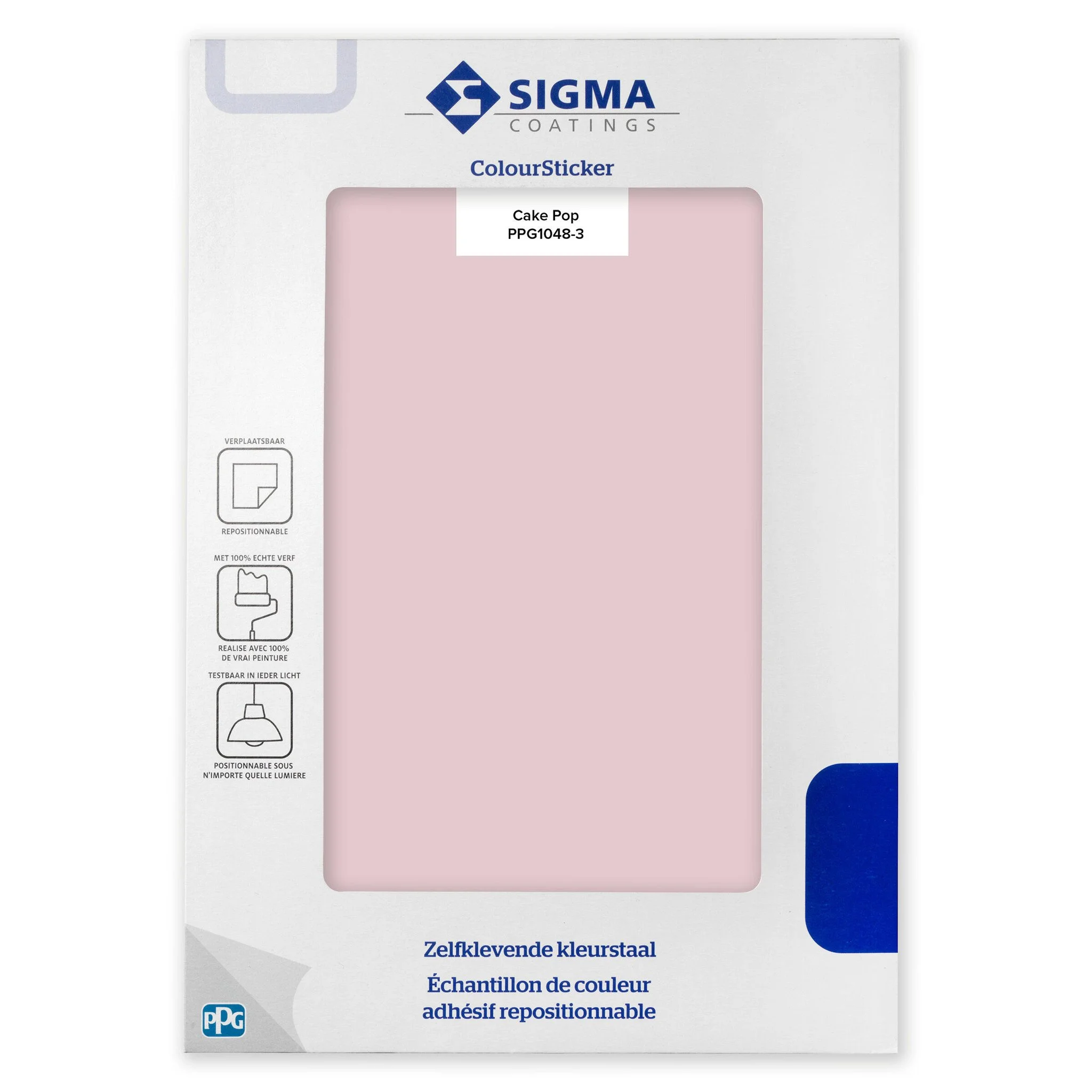 Ben jij op zoek naar een handig hulpmiddel voor jouw kleurkeuze? De Sigma ColourSticker Cake Pop PPG1048-3 is een zelfklevende kleurstaal welke het kiezen van een kleur aanzienlijk makkelijker maakt. Deze zelfklevende kleurstaal is gemaakt van 100% echte verf en plak je met het grootste gemak op diverse ondergronden in en rondom jouw huis. Hierdoor kan je afstand nemen en eenvoudig het grote plaatje bekijken. Daarnaast kan de kleurtester ook over structuur ondergronden worden geplakt zonder dat de structuur verloren gaat, zo ben je verzekerd van een echte impressie van het eindresultaat. Een van de grote voordelen is dat deze zelfklevende kleurstaal meermaals te verplaatsen is. Hierdoor is de kleurstaal testbaar in ieder licht en op elke plaats in het huis.