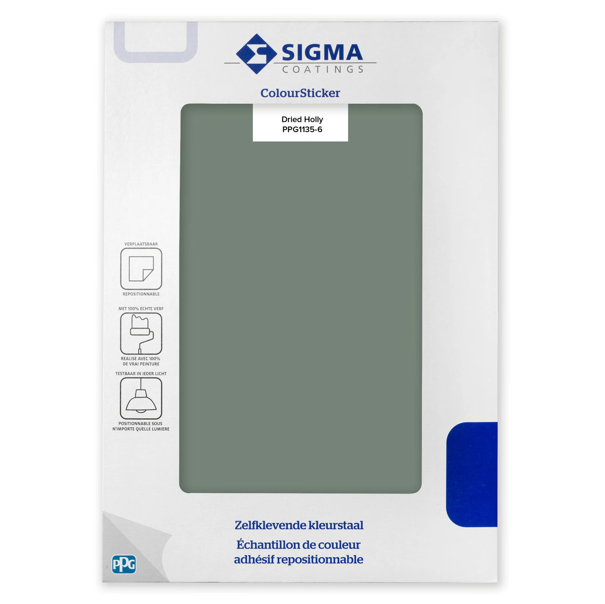Ben jij op zoek naar een handig hulpmiddel voor jouw kleurkeuze? De Sigma ColourSticker Dried Holly PPG1135-6 is een zelfklevende kleurstaal welke het kiezen van een kleur aanzienlijk makkelijker maakt. Deze zelfklevende kleurstaal is gemaakt van 100% echte verf en plak je met het grootste gemak op diverse ondergronden in en rondom jouw huis. Hierdoor kan je afstand nemen en eenvoudig het grote plaatje bekijken. Daarnaast kan de kleurtester ook over structuur ondergronden worden geplakt zonder dat de structuur verloren gaat, zo ben je verzekerd van een echte impressie van het eindresultaat. Een van de grote voordelen is dat deze zelfklevende kleurstaal meermaals te verplaatsen is. Hierdoor is de kleurstaal testbaar in ieder licht en op elke plaats in het huis.