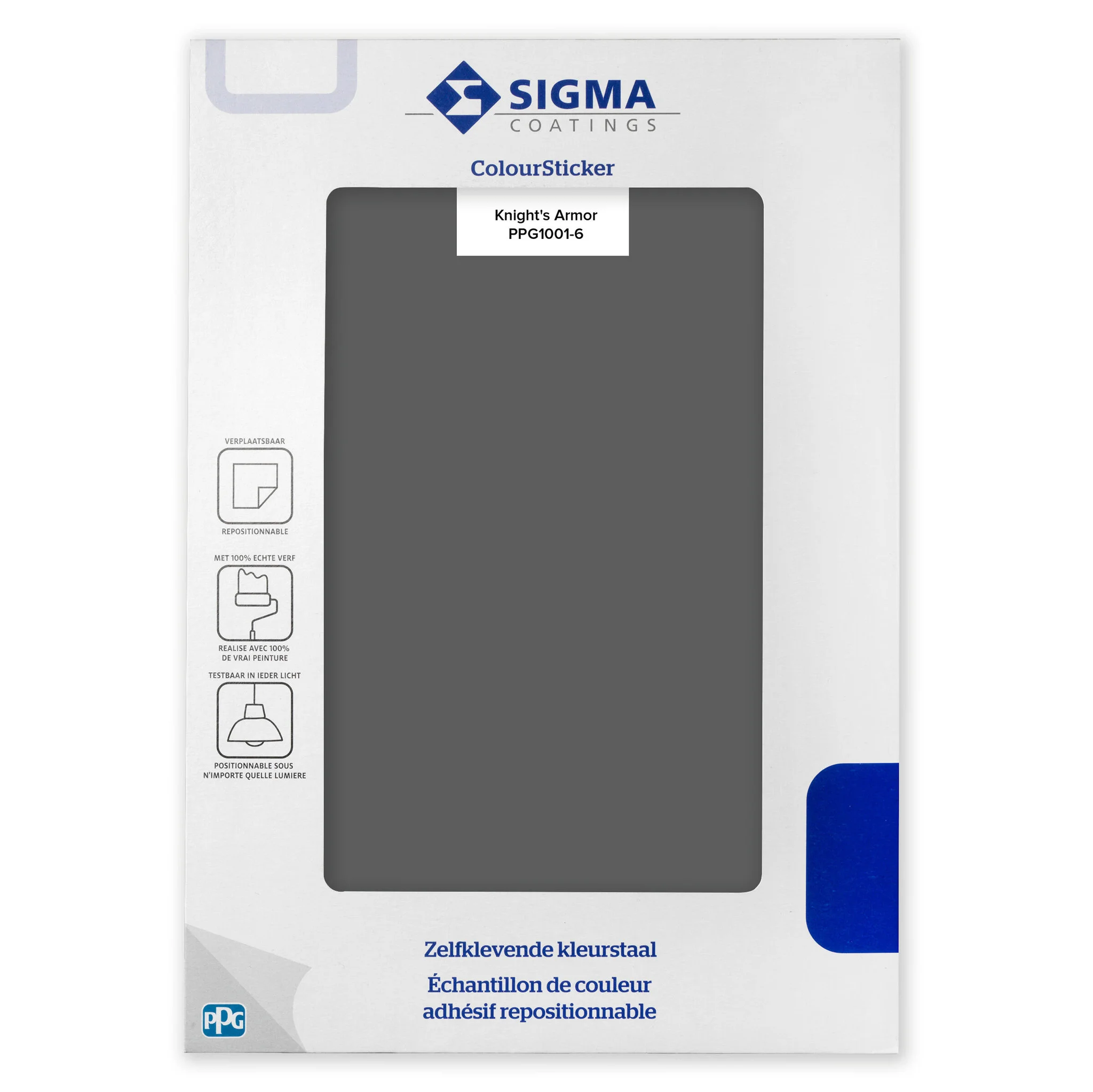 Ben jij op zoek naar een handig hulpmiddel voor jouw kleurkeuze? De Sigma ColourSticker Knight's Armor PPG1001-6 is een zelfklevende kleurstaal welke het kiezen van een kleur aanzienlijk makkelijker maakt. Deze zelfklevende kleurstaal is gemaakt van 100% echte verf en plak je met het grootste gemak op diverse ondergronden in en rondom jouw huis. Hierdoor kan je afstand nemen en eenvoudig het grote plaatje bekijken. Daarnaast kan de kleurtester ook over structuur ondergronden worden geplakt zonder dat de structuur verloren gaat, zo ben je verzekerd van een echte impressie van het eindresultaat. Een van de grote voordelen is dat deze zelfklevende kleurstaal meermaals te verplaatsen is. Hierdoor is de kleurstaal testbaar in ieder licht en op elke plaats in het huis.