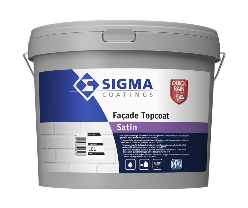 Sigma Facade Topcoat Satin is een zijdeglans gevelverf op waterbasis (100% acrylaatdispersie). Dit product is eenvoudig te verwerken en universeel toe te passen op verschillende ondergronden. Denk hierbij aan beton, metselwerk, cellenbeton, pleisterwerk en cementgebonden plaatmaterialen. Maar ook aan het overschilderen van bestaande, intacte muurverflagen op basis van kunstharsdispersie. Vanwege de zeer goede buitenduurzaamheid en regendichtheid van dit product ben je verzeker van een langdurig en mooi dekkende resultaat.