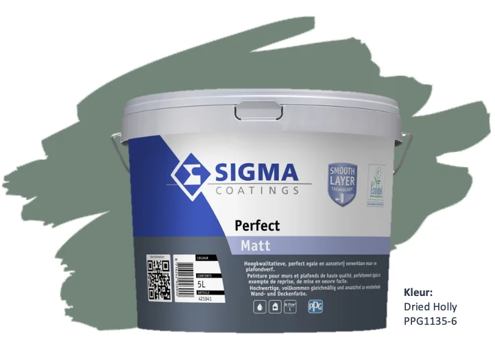 De Sigma PPG1135-6 Dried Holly is een wat meer donkere, groenachtige kleur die een goede kleurrijke basis kan geven voor een huis met wittinten. En met de Sigma Perfect Matt ben je er zeker van dat deze kleur perfect op jouw muren- en plafonds zal opdrogen. Wij hebben de volgende combinatie voor je opgesteld, deze kan je vinden bij de afbeeldingen van dit product. Wij adviseren de PPG1135-6 Dried Holly met de RAL 9003 en de RAL 9001. Ben je net zo enthousiast over deze kleur als wij? Bestel Discover dan in de Sigma Perfect Matt voor een perfect resultaat. Deze kleur is overal toepasbaar. Denk hierbij onder andere aan de: