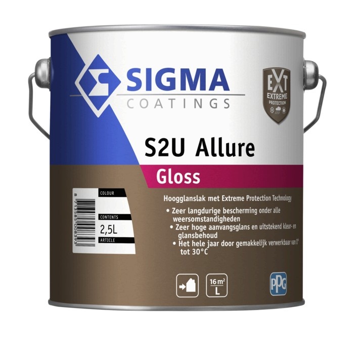 De Allure Gloss is het paradepaardje van Sigma. Met deze superieure lakverf wordt schilderen een feest, ook voor de doe-het-zelver. Dat komt omdat deze prachtige lakverf buitengewoon makkelijk verwerkt en mooi glad vloeit. Dit product kan ervoor zorgen dat je buiten 10 jaar onderhoudsvrij schilderwerk hebt. De Sigma S2U Allure Gloss is met recht een lakverf met Allure. Deze verf wordt veelal gekozen vanwege de enorm hoge duurzaamheid buiten en onderhoudsvrij garantie.