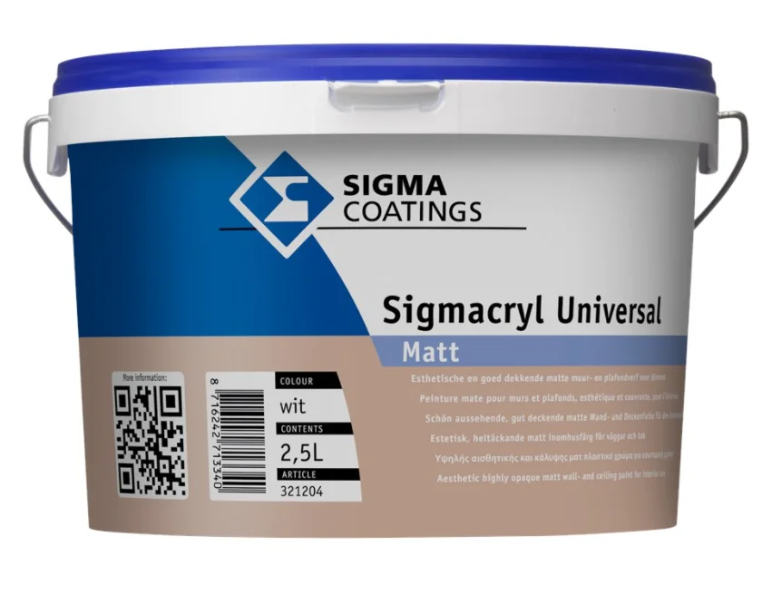 De Sigma Sigmacryl Universal Matt is een muurverf voor schilderwerk binnenshuis. Dit product is breed toepasbaar en licht reinigbaar. Op zoek naar een beter reinigbare muurverf? Ga dan eerder voor de Sigma Sigmatex Superlatex Matt of de Sigma Sigmapearl Clean Matt. De Sigma Sigmacryl Universal Matt kan worden toegepast in vochtige ruimtes, zoals badkamer en keuken, met uitzondering van het douchegedeelte. Niet op een gesloten ondergrond (bijvoorbeeld alkydharsverf) aanbrengen. De combinatie van een gesloten ondergrond met een dampdoorlatende muurverf kan bij vochtbelasting tot onthechting leiden. Deze verf is uitstekend verspuitbaar met een airless-verfspuit en is waterdampdoorlatend. Tot slot vergeelt deze verf niet waardoor het product ook toegepast kan worden in de ruimtes waar weinig daglicht binnenkomt.