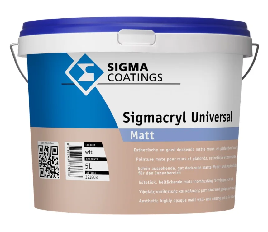 De Sigma Sigmacryl Universal Matt is een muurverf voor schilderwerk binnenshuis. Dit product is breed toepasbaar en licht reinigbaar. Op zoek naar een beter reinigbare muurverf? Ga dan eerder voor de Sigma Sigmatex Superlatex Matt of de Sigma Sigmapearl Clean Matt. De Sigma Sigmacryl Universal Matt kan worden toegepast in vochtige ruimtes, zoals badkamer en keuken, met uitzondering van het douchegedeelte. Niet op een gesloten ondergrond (bijvoorbeeld alkydharsverf) aanbrengen. De combinatie van een gesloten ondergrond met een dampdoorlatende muurverf kan bij vochtbelasting tot onthechting leiden. Deze verf is uitstekend verspuitbaar met een airless-verfspuit en is waterdampdoorlatend. Tot slot vergeelt deze verf niet waardoor het product ook toegepast kan worden in de ruimtes waar weinig daglicht binnenkomt.